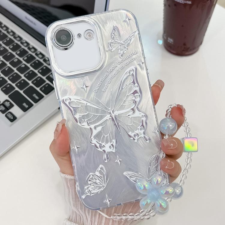 For iPhone 16e Plating Texture Butterfly Wristband TPU Phone Case with Glitter Lens Film(Silver Butterflies HU6)