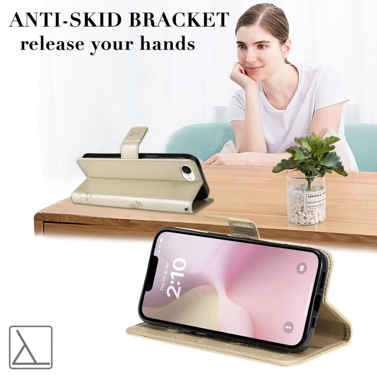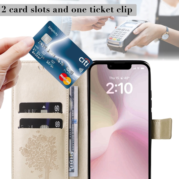 For iPhone 16e Tree & Cat Embossed Pattern Flip Leather Phone Case(Gold)
