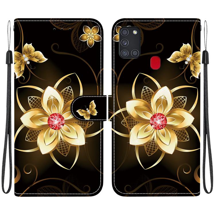 For Samsung Galaxy A21s Crystal Texture Colored Drawing Leather Phone Case(Gold Flower)