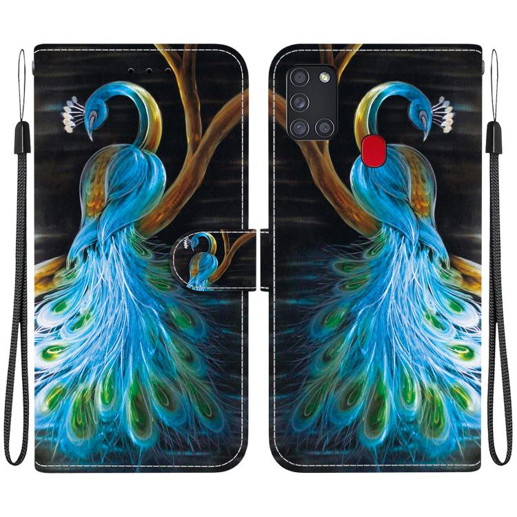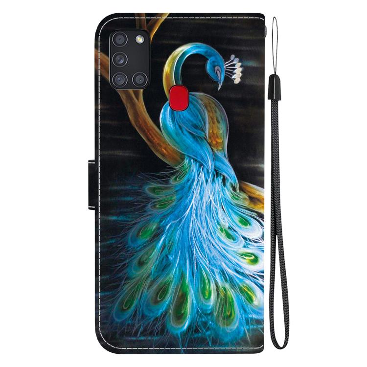 For Samsung Galaxy A21s Crystal Texture Colored Drawing Leather Phone Case(Peacock)