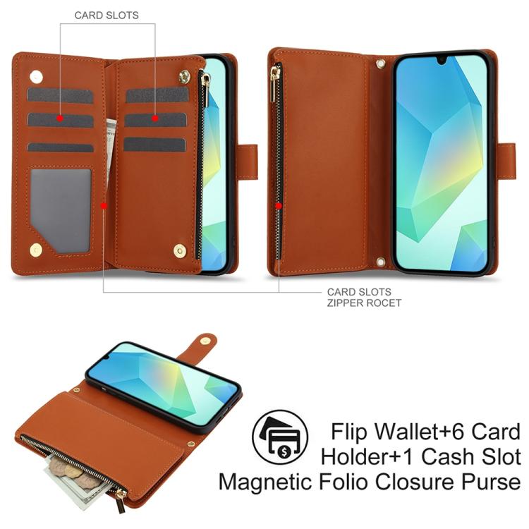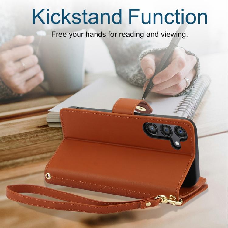 For Samsung Galaxy A26 5G YM016 Rhombic Zipper Card Wallet Leather Phone Case with Lanyard(Brown)