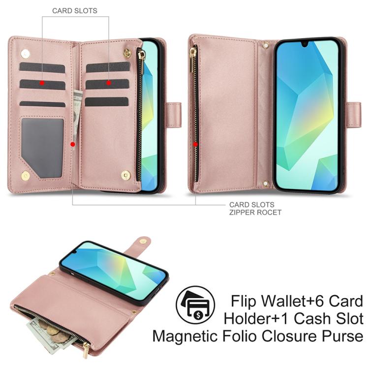 For Samsung Galaxy A26 5G YM016 Rhombic Zipper Card Wallet Leather Phone Case with Lanyard(Rose Gold)