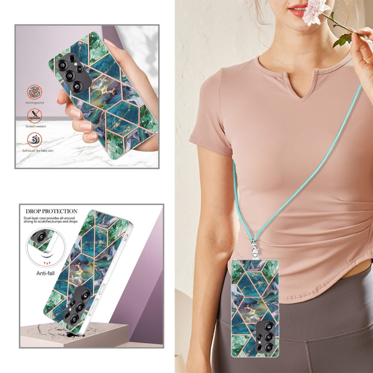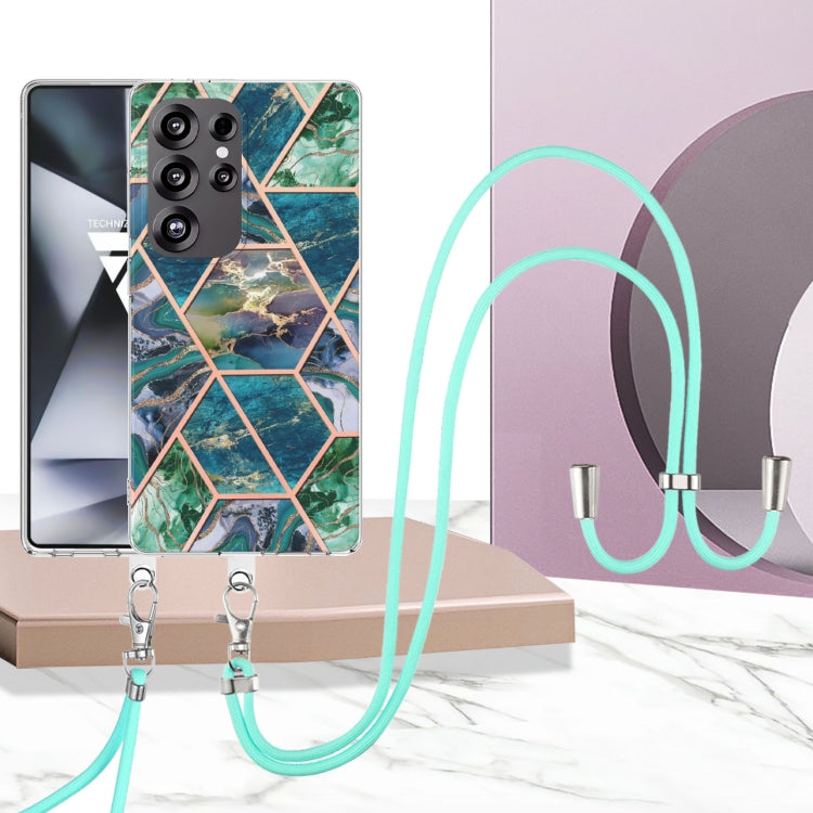 For Samsung Galaxy S25 Ultra 5G Electroplating IMD Splicing Dual-side Marble TPU Phone Case with Lanyard(Blue Green)
