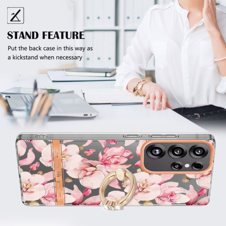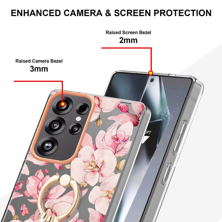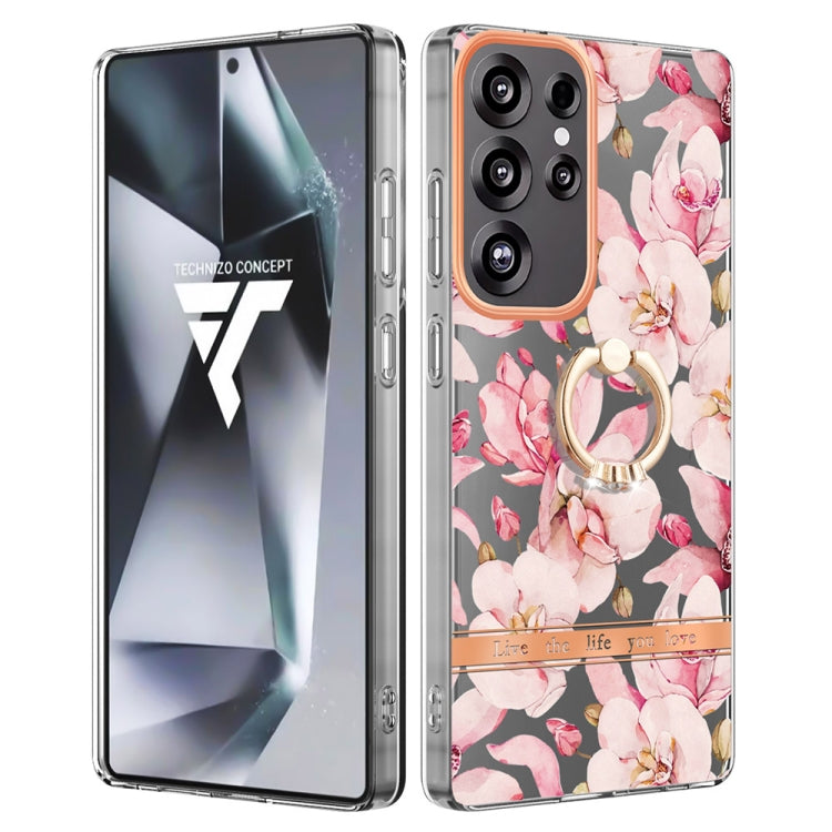 For Samsung Galaxy S25 Ultra 5G Flowers and Plants Series IMD TPU Phone Case with Ring Holder(Pink Gardenia)