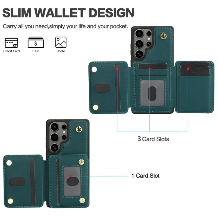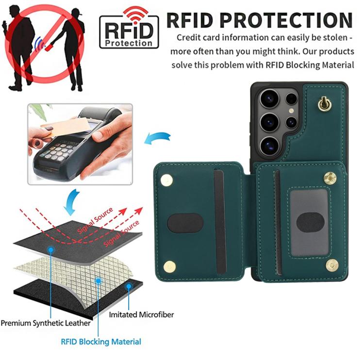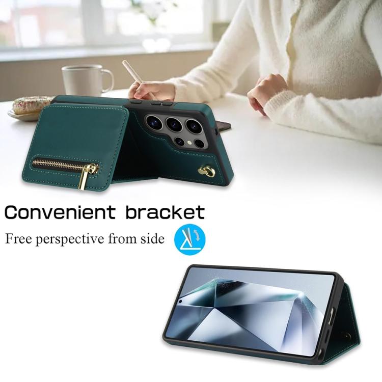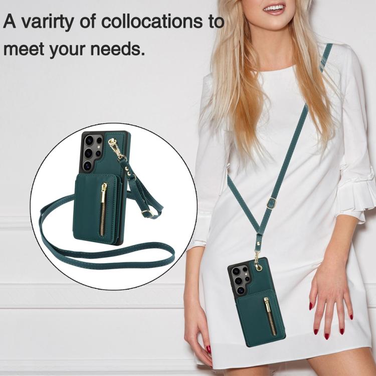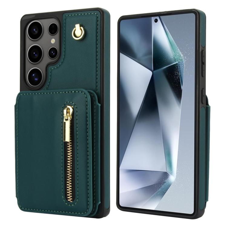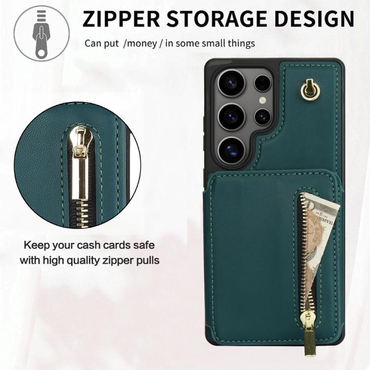 For Samsung Galaxy S25 Ultra 5G YM006 Skin Feel Zipper Card Bag Phone Case with Dual Lanyard(Green)