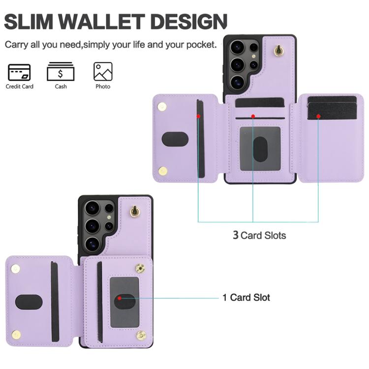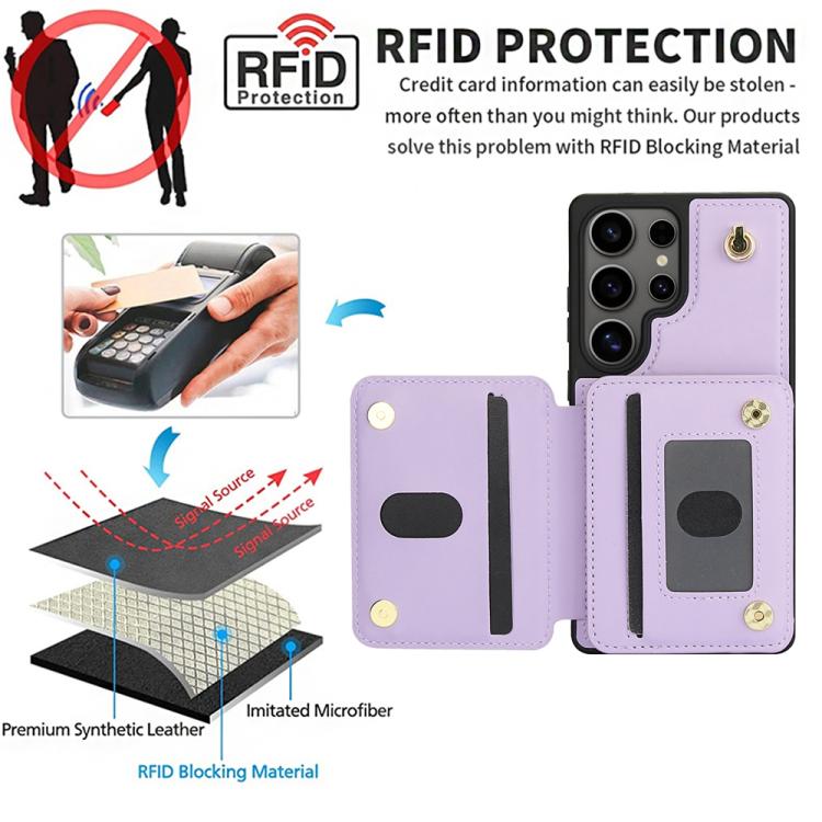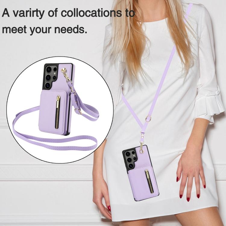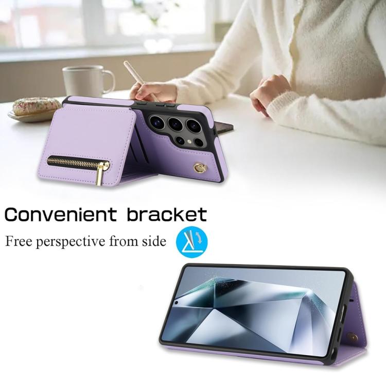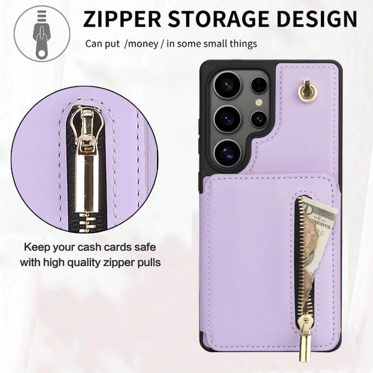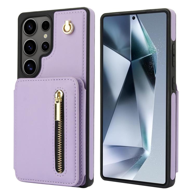For Samsung Galaxy S25 Ultra 5G YM006 Skin Feel Zipper Card Bag Phone Case with Dual Lanyard(Light Purple)