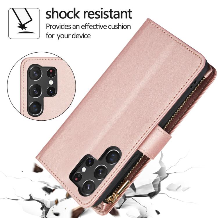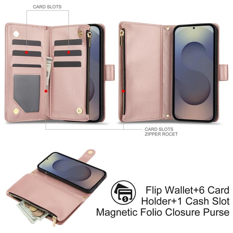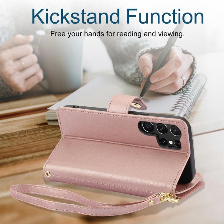 For Samsung Galaxy S25 Ultra 5G YM016 Rhombic Zipper Card Wallet Leather Phone Case with Lanyard(Rose Gold)