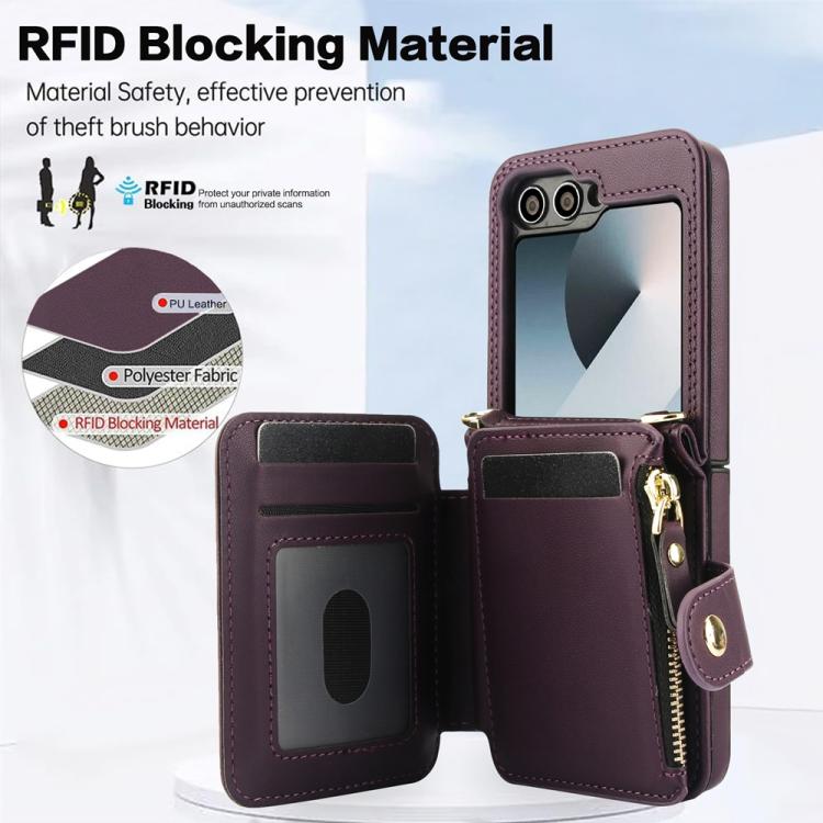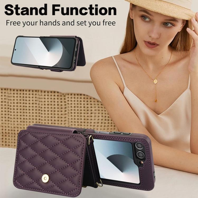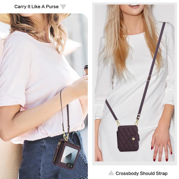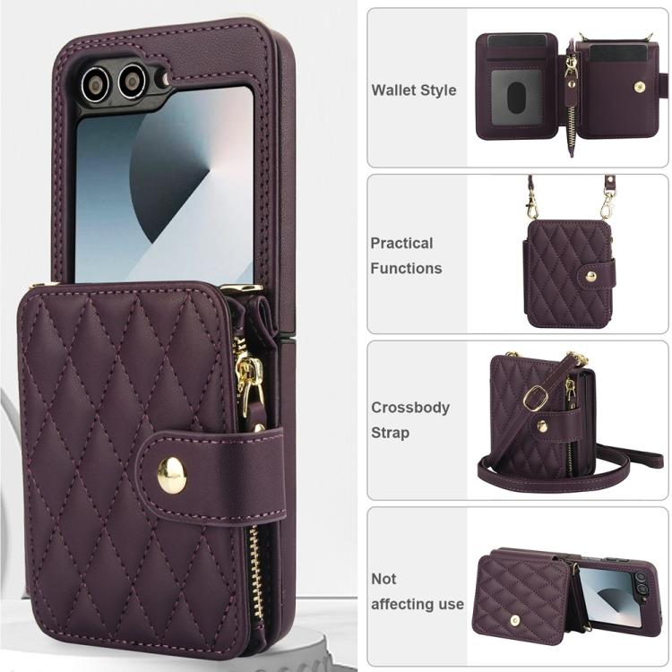 For Samsung Galaxy Z Flip5 Crossbody Rhombus Wallet Bag Folding Phone Case with Lanyard(Dark Purple)